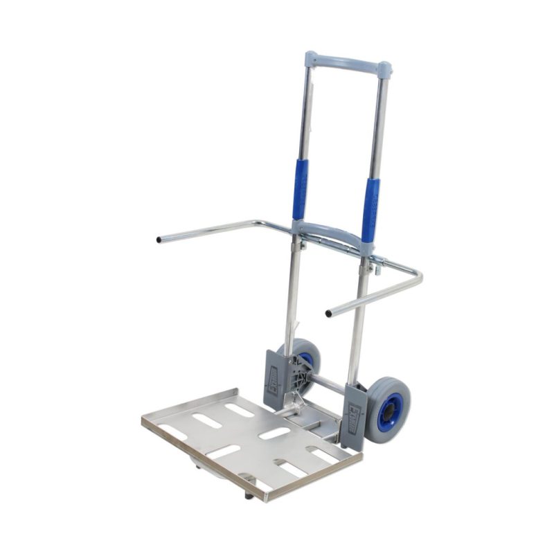 Ez a praktikus szállítási megoldás három csuklós elemmel rendelkezik. A szár, a rakfelület, tálca és a tartókeret összehajtható, és a kocsi 73 cm magasságra állítható.