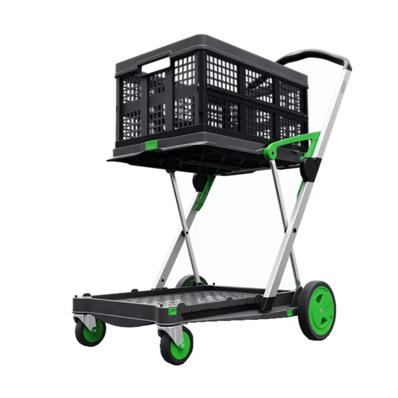 Összecsukható kiskocsi , műanyag rácsos ládával.