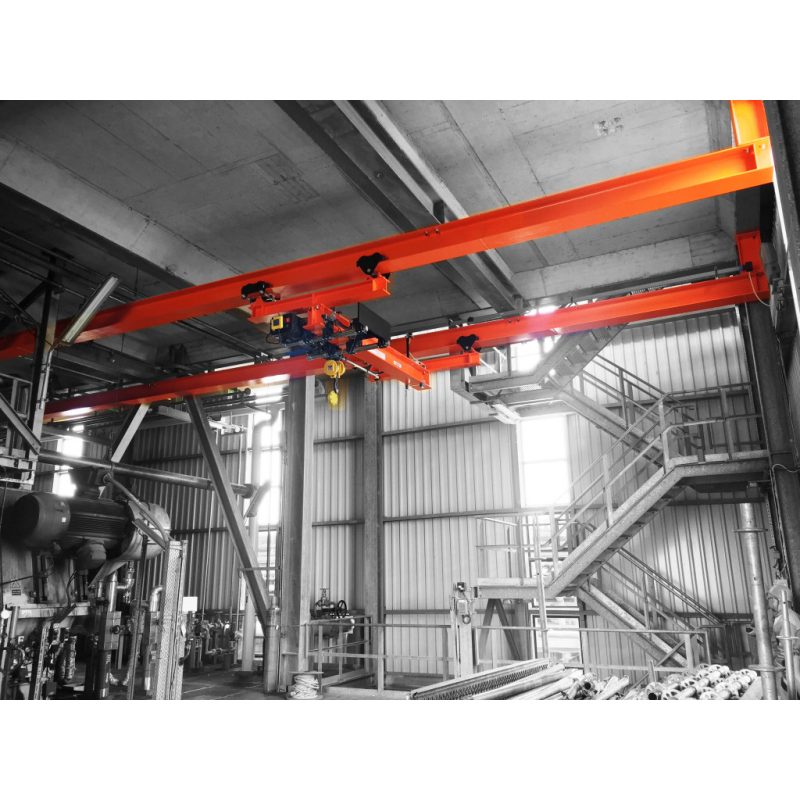 A függeszett híddaru alacsony építésű sodronyköteles (vagy láncos) emelőművel rendelhető a felhasználástől függően.